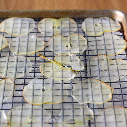Add the sugar and water to a 3-qt saucepan and bring to a boil, stirring frequently. Add the apple slices and cook, stirring frequently, for about 10 minutes, or until they are translucent and the syrup has reduced and thickened slightly. Use tongs to remove the slices from the syrup and place them on the wire rack in a single layer. (You can discard the syrup or save it – it’s amazing apple-flavored simple syrup!)
