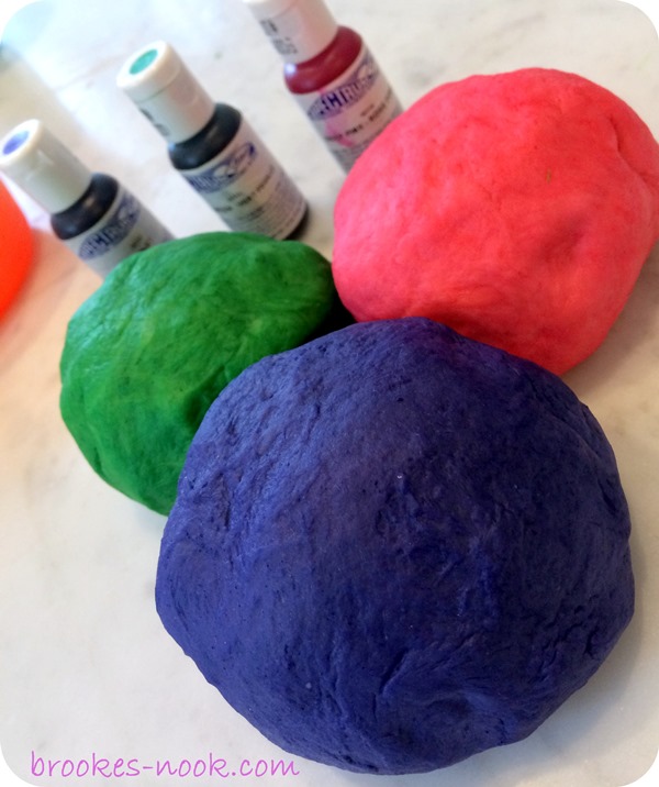 - Shape dough into a ball and return to its bowl. Repeat with remaining pieces of dough, dying each a different color (red + blue makes purple), being sure to wash your hands/gloves and your work surface between each color.