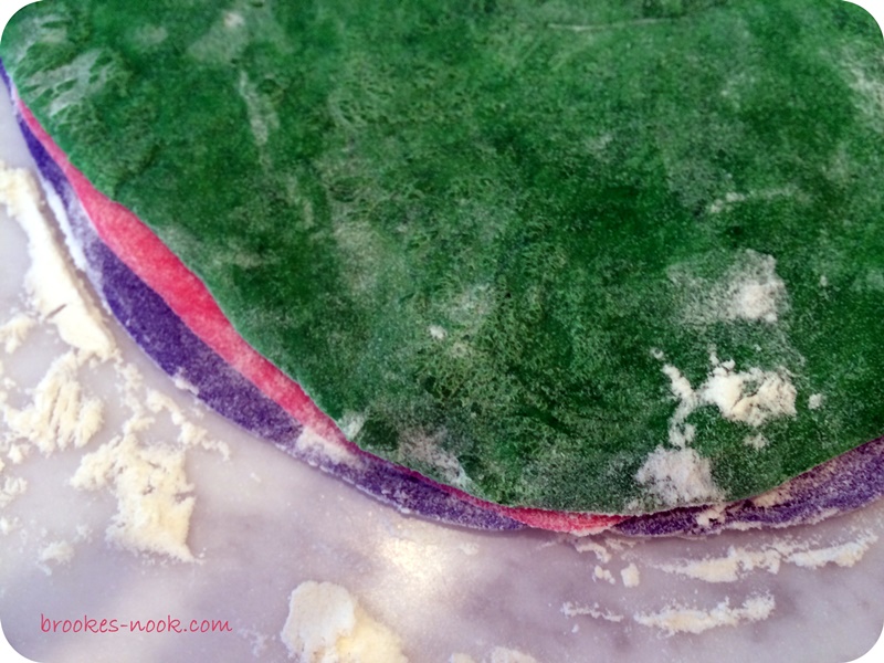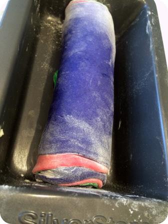 - When dough is risen, punch down dough. Remove red dough and roll out on a lightly floured surface into an 8-by-4-inch rectangle. Roll out yellow piece of dough into an 8-by-4-inch rectangle and place directly on top of red dough. Repeat with green, then blue, then purple doughs until you have a stack of 8-by-4-inch rectangles.